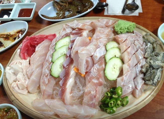 ▶ 특징: 민어의 다양한 부위를 한 접시에 즐길 수 있어 풍부한 맛 경험 가능, 숙성 과정을 거쳐 비린내 없이 깔끔