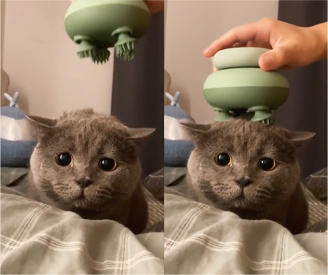 고양이의 머리 위로 내려오는 마사지기입니다. 주인은 고양이에게 안락한 기분을 안겨주기 위해, 마사지기를 사용한 것 같은데요. 고양이는 처음 보는 이 기계가 많이 낯선 것 같습니다. 그럼에도 도망치지는 않죠. 억지로라도 용기를 낸 걸지도요.