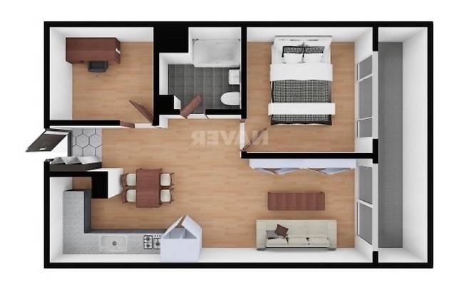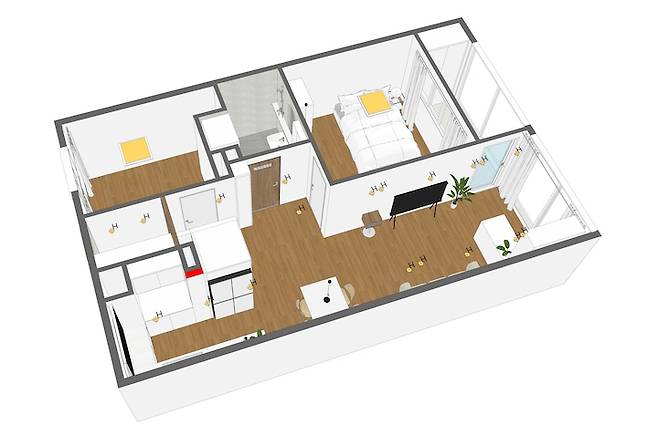 바뀐 도면을 보시면 구조 변경이 살짝 있습니다! 우선 집이 아담하기 때문에 거실에 홈 오피스를 두기 위해 베란다 확장은 필수로 진행했어요. 그리고 기존 20평대 구축 복도식 아파트 구조를 보면 대부분 냉장고가 거의 거실 옆에 붙어있는데, 집의 중앙에 냉장고를 두는 것만은 피하고 싶었습니다. 거실과 주방을 분리하고 싶기도 했고요. 그래서 작은방과 주방 사이에 가벽을 설치해서 냉장고 장을 만들고, 조리 공간을 좀 더 확장하기로 했습니다.