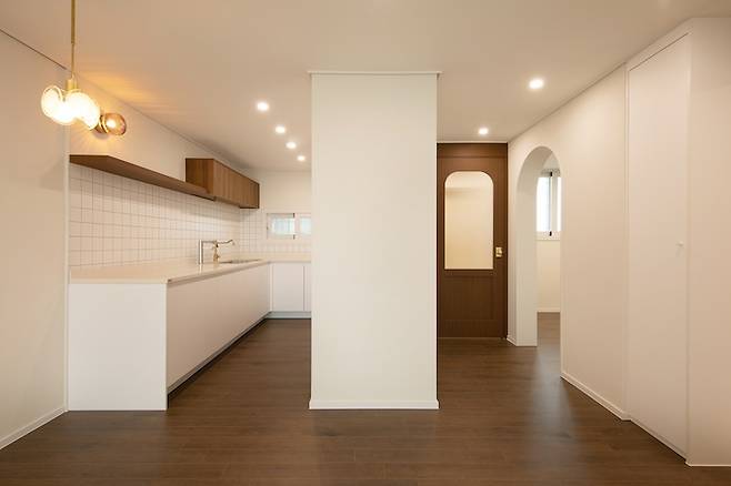 기존 ㄷ자형 주방의 구조를 살리면서 주방 공간을 조금 더 넓혔어요. 중간에 철거가 불가능한 기둥 벽이 있어서 그 기둥과 이어지게 가벽을 세워 냉장고 장을 만들었습니다. 주방부터 거실까지 길게 이어진 구조라서 사실 그 중간의 공간은 버려지기 쉬운데 가벽을 세우니 주방, 거실, 현관이 분리도 되고 공간을 더 효율적으로 사용할 수 있게 되었어요.