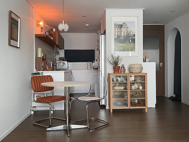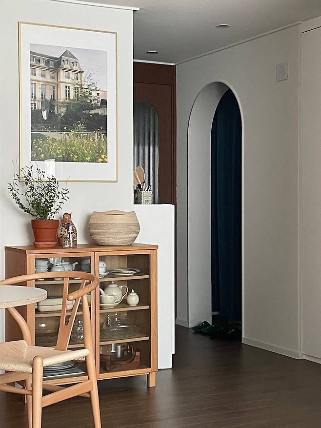 냉장고 장으로 생긴 가벽 앞에는 그릇 선반장을 두었어요. 유리 도어라 내부가 다 보여서 이곳에는 부모님께 물려받은 예쁜 다기 용품과 크리스탈 그릇 등을 보관하고 있습니다. 벽에는 제가 파리 여행 중에 찍었던 사진으로 액자를 만들어 걸었는데 저희 집 분위기의 중심이 되어주는 것 같아서 뿌듯해요. :)