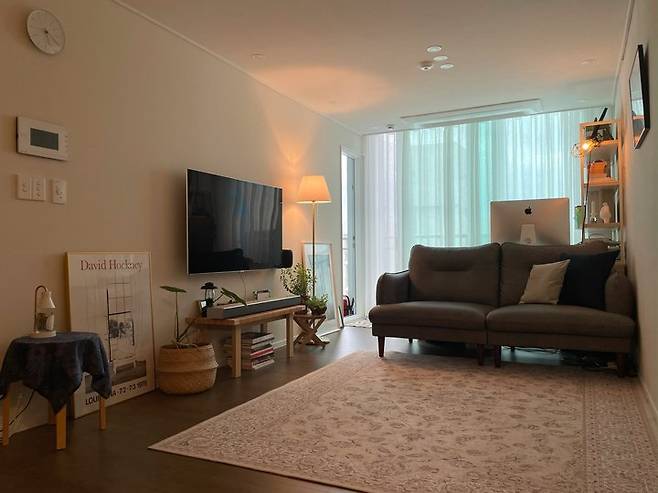 거실은 조금 독특한 구조랍니다. 베란다 확장이 된 공간은 책상과 컴퓨터를 두어 홈 오피스로 꾸몄고요, 그 앞에 바로 소파를 배치해서 파티션처럼 활용 중이에요.