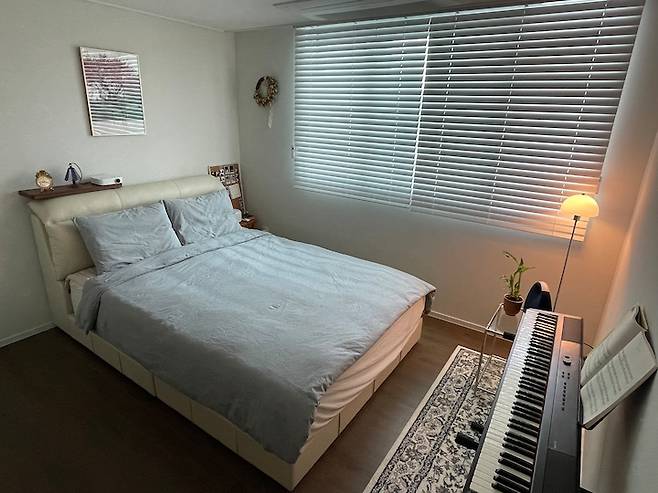 아늑하고 포근한 분위기를 좋아하는 저희 부부는 평소에 천장 조명보다는 스탠드 조명을 켜 두는 편이에요. 그리고 잠들기 전, 침대 위에 누워서 빔으로 영화 보는 걸 정말 좋아해서 침대 맞은편 벽면은 무조건 비워두기로 결정했습니다. 높이가 낮은 건반을 두었더니 작은 스튜디오처럼 보이네요. :)