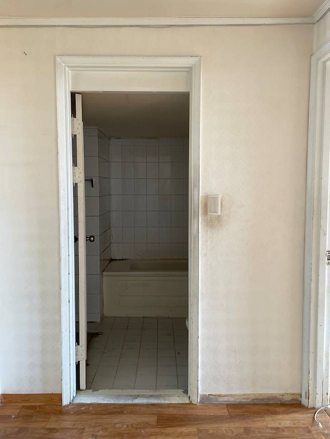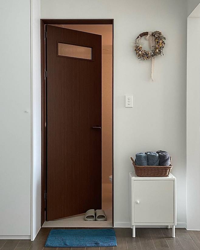 그리고 욕실 왼편에는 작은 붙박이장을 짜서 청소용품 등을 넣는 공간으로 사용 중이에요. 구축은 기본적인 수납공간이 거의 없기 때문에 이 작은 붙박이장이 엄청 소중하네요... ㅎㅎ
