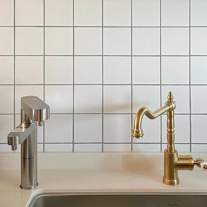 클래식한 느낌의 이케아 수전과 레일을 모두 황동색으로 구매했고요, 벽 조명과 다이닝 공간의 펜던트 등, 액자 프레임 등을 골드로 맞춰서 따뜻한 분위기의 주방을 연출하려고 노력했습니다.