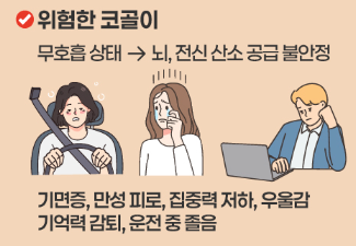 이러한 증상이 꾸준히 반복된다면 단순한 피로가 아니라 수면무호흡증으로 인한 산소 부족과 수면 단절일 수 있습니다.