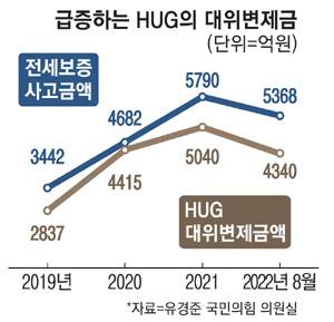 게다가 HUG의 재무구조도 악화하고 있다. 지난봄부터 집주인이 전세금을 돌려주지 못하는 깡통전세가 급증했고 그 영향으로 HUG가 집주인 대신 돌려준 전세금(대위변제금액)도 눈덩이처럼 불어나고 있다. 유 의원실이 확보한 자료에 따르면 HUG의 대위변제금액은 2017년 기준 34억원에서 2021년 5040억원으로 증가했고 올해는 8월까지 4340억원에 달해 연말에는 지난해 변제금액을 훌쩍 넘어설 것으로 예상된다. 이에 따라 HUG의 지급여력비율(가용자본/요구자본) 역시 2021년 9월 524%에서 2022년 8월 216%로 반 토막 난 상황이다.