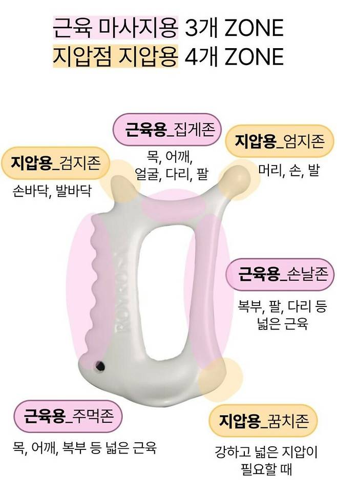 검지존(세밀한 지압), 엄지존(강한 지압), 주먹존(넓은 자극), 손날존(근육 쓸어내림), 꿈치존(강하고 넓은 지압), 손두덩이존(넓게 펴주는 지압용) 등 다양한 손 모양과 용도를 마사지기 하나에 담았습니다.