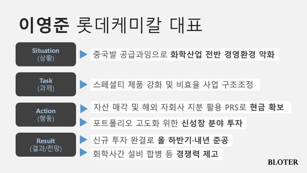 이 대표는 두 그룹 간 빅딜을 계기로 합류했지만 롯데가 지향하는 인사 혁신의 흐름을 상징한다. 당시 신동빈 회장 의지로 대대적인 인적 쇄신이 이뤄졌고 유통·호텔 계열사 대표급 자리는 외부 출신이 차지했다. 이러한 세대교체 분위기는 화학 부문에도 연쇄적으로 영향을 끼쳤고 이 대표가 적임자로 꼽혔다.