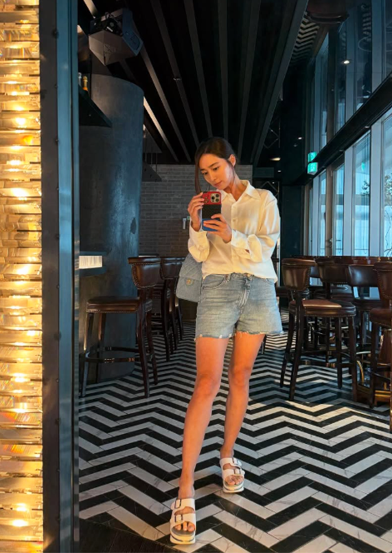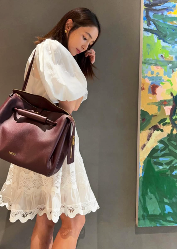 화려한 디테일이 들어간 밑단과 함께 청순한 분위기를 배가시켰으며, 여기에 톤다운된 버건디 컬러의 백을 매치해 전체 스타일링에 포인트를 더했다.