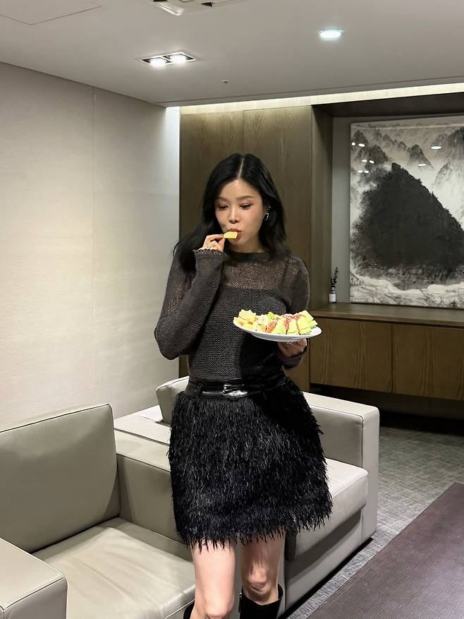 그녀는 속이 은은하게 비치는 시스루 니트에 풍성한 퍼 스커트를 매치해 모두를 놀라게 했다.