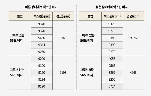 민무늬 웨지에서는 놀랄만한 변화가 생겼다. 평균 백스핀이 4963rpm으로 뚝 떨어졌다. 다섯 차례 샷의 스핀 양도 4056rpm, 2568rpm, 3269rpm, 9200rpm, 5724rpm으로 들쑥날쑥했다. 가장 높은 백스핀과 가장 적은 백스핀 차이는 6632rpm이나 됐다. 가장 적은 2568rpm은 습기가 있을 때 일반 웨지의 평균 백스핀(9326rpm)보다 72%나 감소한 수치였다.