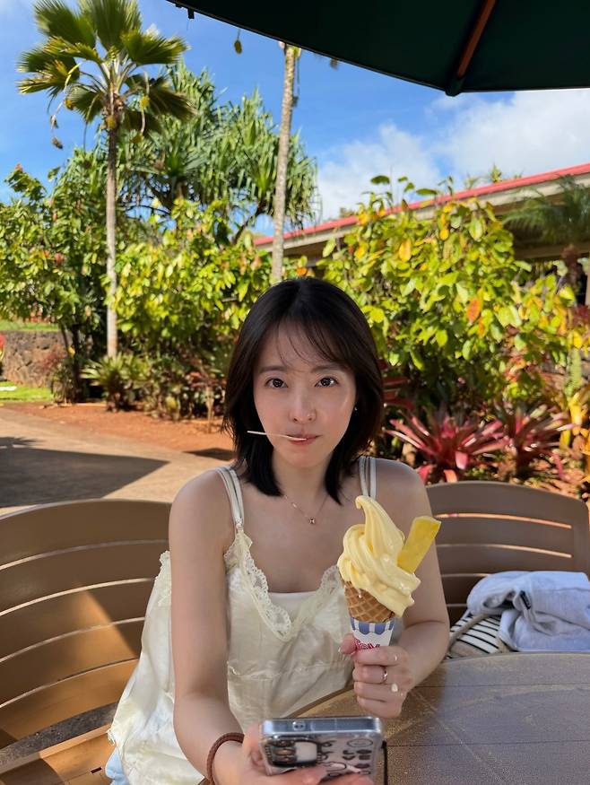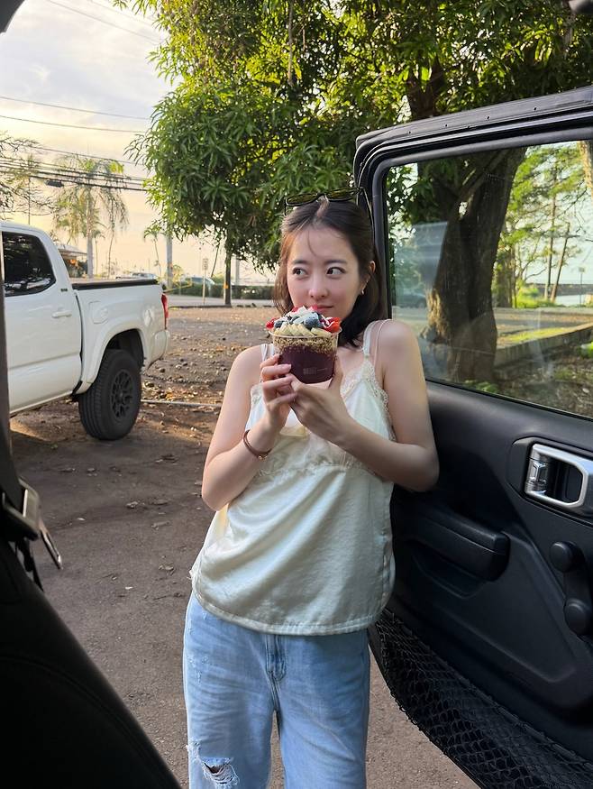 맛있는 아사이 볼을 들고 환하게 미소 짓는 그녀의 모습은 마치 여름 휴가지에서 만난 듯한 싱그러운 아우라를 풍깁니다.