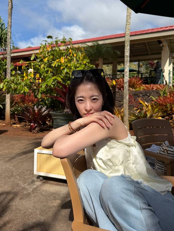 내추럴하게 묶어 올린 헤어스타일 위에 무심하게 얹은 선글라스는 꾸민 듯 안 꾸민 듯 자연스러운 '꾸안꾸' 매력을 배가시킵니다.