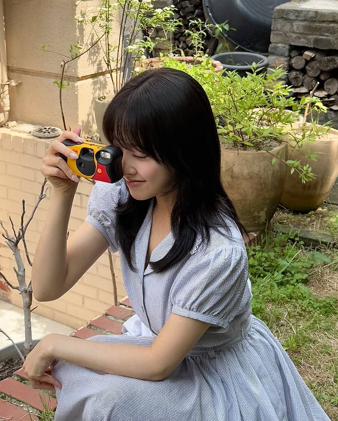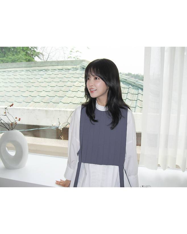 네이비 베스트와 화이트 블라우스의 레이어드 스타일링으로 모던한 감각을 보여주고 있다. 깔끔한 컬러 조합과 단정한 실루엣으로 지적이면서도 세련된 이미지를 연출했다. 자연광 아래에서 더욱 돋보이는 청순한 매력을 발산하고 있다.