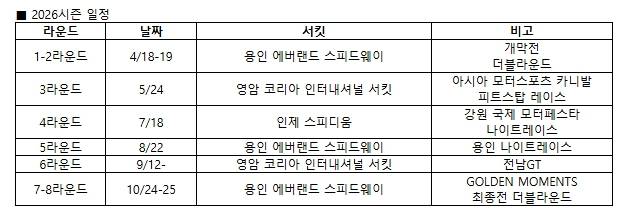 9월 12~13일에는 영암 코리아 인터내셔널 서킷에서 전남GT가 개최되며, 10월 24~25일 용인 에버랜드 스피드웨이에서 더블라운드로 펼쳐지는 'GOLDEN MOMENTS'가 2026시즌 최종전으로 대미를 장식한다.
