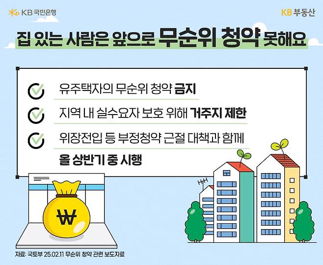 앞으로 집이 있는 사람은 무순위 청약, 일명 ‘줍줍’에 도전할 수 없게 된다고 합니다. 1월 13일, 정부는 ‘2025년 주요업무 추진계획’에서 2월 중 무순위 청약을 비롯한 청약 제도를 손 볼 계획이라고 밝혔는데요. 지난 2월 11일 국토부에서 무순위 청약 관련 개선안이 나왔습니다. 부동산에 관심있는 분이라면 한번은 도전해 봤을 '무순위 청약'이 앞으로 어떻게 달라질지 KB부동산이 정리해 드립니다.