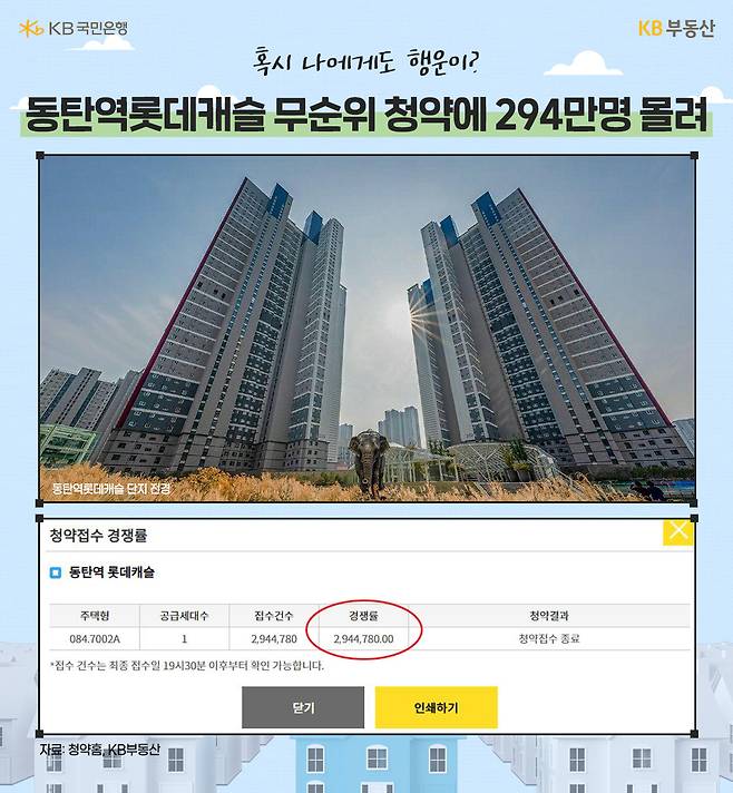일례로 지난해 7월, 동탄신도시의 한 아파트 1가구 무순위 청약 모집에 294만여 명이 몰린 적도 있습니다. 바로 화성시 오산동 동탄역롯데캐슬인데요. 이 단지는 2021년 6월 입주한 940세대 단지로, 전용면적 84㎡ 1가구 무순위 청약이 7년 전 분양가로 나와 화제가 됐습니다.