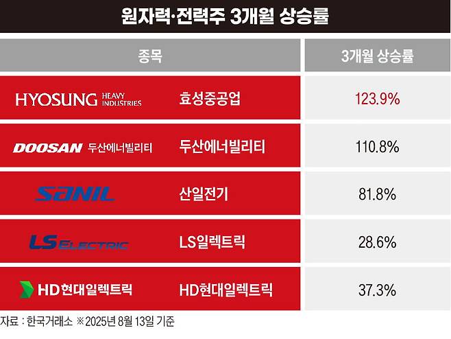 한때 AI ‘테마주’처럼 여겨지던 전력 관련주가 올해도 상승세를 이어가고 있다. 원자력 대표주자인 두산에너빌리티는 8월 13일 기준 3개월간 110.8% 뛰었고 변압기를 수출하는 효성중공업(123.9%), HD현대일렉트릭(37.3%), LS일렉트릭(28.6%) 역시 가파른 상승곡선을 그렸다.