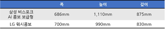 색상 구성을 보면 워시콤보는 스페이스 블랙, 릴리 화이트, 모던 스테인레스, 네이처 베이지, 네이처 그린까지 5가지이다. 삼성 비스포크 AI 콤보는 에센셜 화이트, 다크스틸, 새틴 라이트베이지까지 3가지로 차이가 있다.