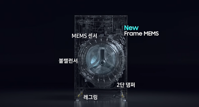 보급형 모델의 진동 저감 시스템 구조는 레그링 + 2단 댐퍼 + 볼밸런서 + MEMS 센서로 구성된다. 제품 동작 시 진동을 감지하면 모터를 조절하고 드럼의 위치 밸런스와 바닥 진동을 컨트롤함으로써 소음을 효율적으로 줄이는 방식이다.