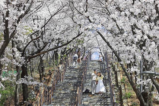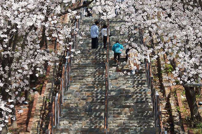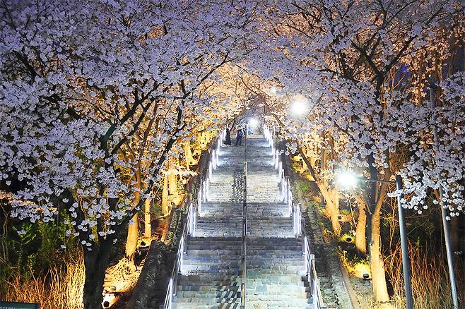 나무 계단을 따라 오르다 보면 좌우로 만개한 벚꽃이 터널처럼 이어지고, 발아래로는 북구 시내가 아련하게 펼쳐진다.