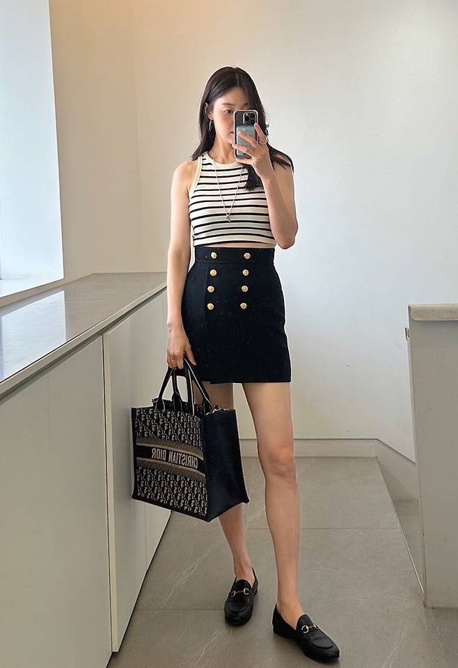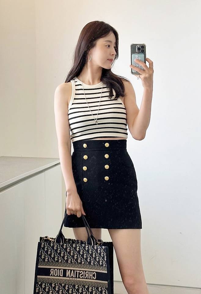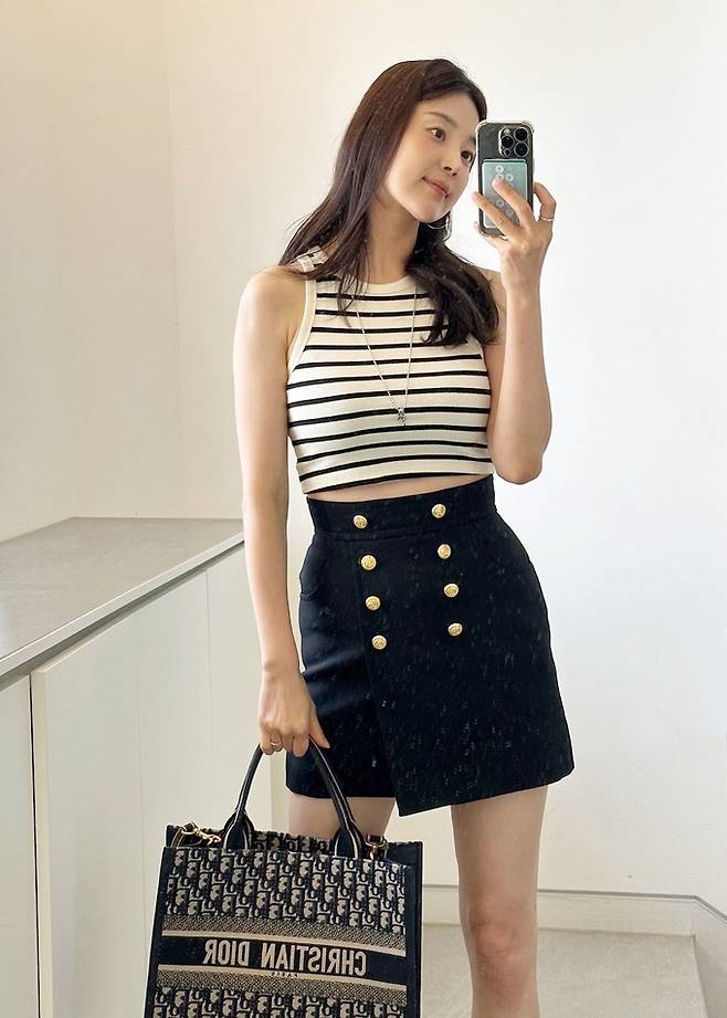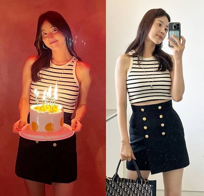 배우 한지혜가 스트라이프 크롭톱과 버튼 미니 스커트로 상큼한 여름 생일 파티룩을 완성했다.