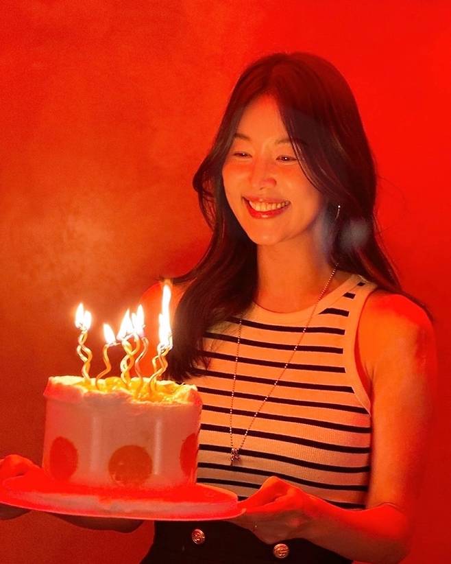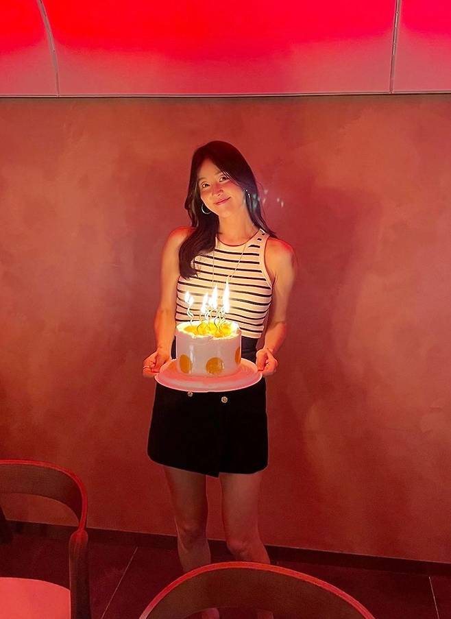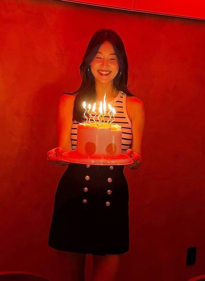 공개한 사진에서 한지혜는 복근이 살짝 드러난 스트라이프 민소매 크롭톱과 금색 버튼이 멋스러운 미니 스커트를 입고 발랄하면서도 상큼한 생일 파티룩을 선보였다.