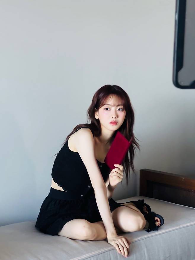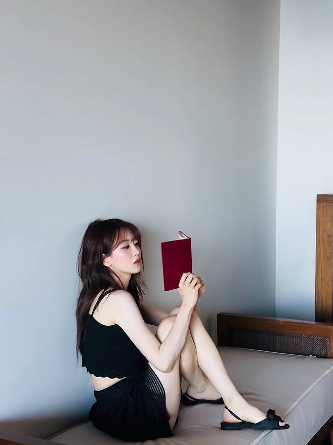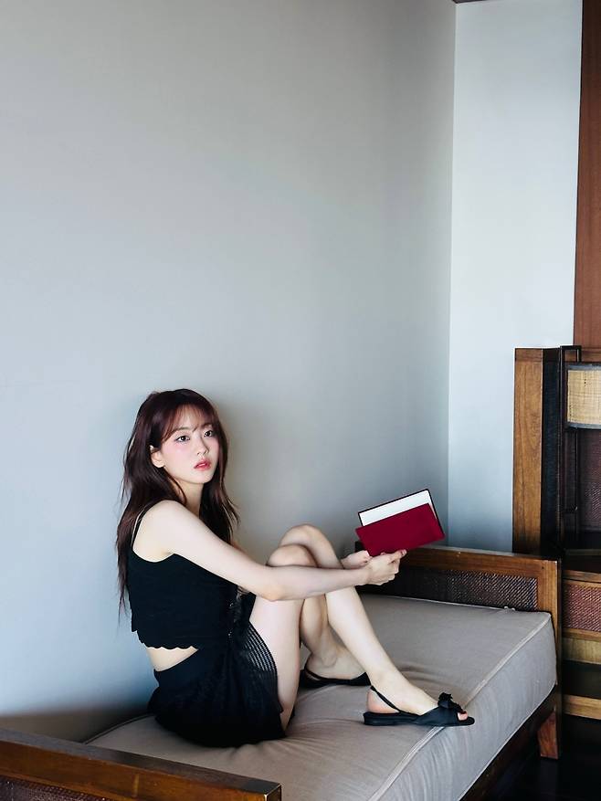 특히 얇은 스트랩 샌들과 와인색 미니 북은 룩 전체의 무드를 감성적으로 끌어올리는 포인트였어요.