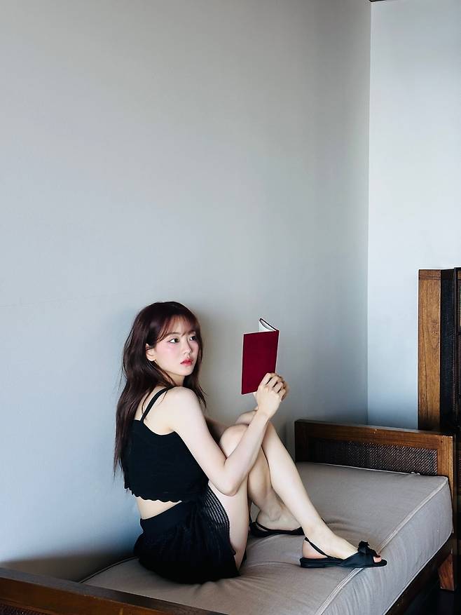 소파 위에 편안히 앉은 채 책을 드는 제스처 하나까지도 연출처럼 느껴지지 않고 자연스럽죠.
