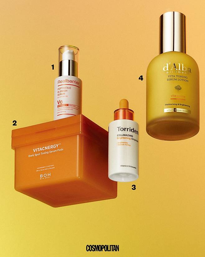 K-뷰티의 인기가 높아지면서 한국인의 맑고 깨끗한 피부에 대한 관심도 함께 커지고 있다. 특히 화장기 없이도 맑은 광채가 도는 ‘글래스 스킨’ 이미지가 부각되며 #브라이트닝, #미백, #속광과 같은 키워드를 중심으로 한국 스킨케어 제품에 대한 전 세계적 관심이 높아지는 중이다. 이 흐름의 중심엔 브라이트닝과 항노화를 대표하는 ‘비타민 C’가 있다. 멜라닌 생성을 억제해 잡티를 완화하고, 자외선으로 인한 산화 스트레스를 줄이며, 콜라겐 생성을 촉진해 탄력 개선에도 도움을 주기 때문. 그 인기를 방증하듯 2025년 5월 기준으로 아마존 K-세럼 카테고리 베스트셀러 상위 50위 안에 비타민 C를 주성분으로 한 제품이 12개나 랭크됐다. 달바의 ‘비타 라인’과 코스알엑스의 ‘더 비타민 C 23 세럼’, 조선미녀의 ‘병풀비타세럼’ 등이 그 주인공. 이러한 제품들 모두 비타민 C의 미백 기능과 항산화 작용을 극대화하면서 피부 자극을 줄이기 위해 시카나 비타민 E, 나이아신아마이드 등을 배합했다는 점도 눈여겨볼 만하다. 미국판 〈코스모폴리탄〉의 뷰티 에디터 베스 질렛은 작년 12월 공개된 K-뷰티 비타민 C 스킨케어 체험 기사에서 “비타민 C 세럼은 예민한 피부에는 자극적일 수 있어요. 하지만 K-뷰티에서 그 대안을 찾을 수 있죠. 한국산 비타민 C 세럼은 다양한 활성 성분을 배합하고, 건조함이나 자극을 줄여주는 진정 성분을 듬뿍 담아 민감한 피부도 쓸 수 있게 만들었거든요”라고 설명한다. 또 캡슐화와 리포솜화 기술로 산화를 방지하고 따가움 없이 사용할 수 있다는 점도 인기 요인 중 하나. 그렇다면 국내 시장은 어떨까? 닥터자르트는 고농축 비타민 C와 나이아신아마이드를 동결건조한 볼 형태로 만들어 사용 직전에 에센스와 섞어 쓰는 ‘브라이타민 브라이트닝 세럼 앰플’을 출시했다. 이뿐만 아니라 이니스프리는 비타민 C를 선크림과 결합해 낮에도 손쉽게 바를 수 있도록 편의성을 높인 ‘비타민 C 잡티 톤업 선크림’을 선보였고, 일명 ‘흔적 세럼’으로 잘 알려진 아이소이는 미백 기능 성분인 알부틴과 나이아신아마이드에 비타민 C 유도체를 더한 ‘수분광 잡티로션’을 공개했다. 단 두 달 사이에 이렇게 다양한 비타민 C를 메인으로 한 새로운 카테고리의 제품이 잇따라 출시되고 있는 배경에는 슬로 에이징에 대한 관심 확대와 함께 스킨케어의 핵심 키워드로 떠오르고 있는 ‘산화 스트레스’ 관리가 있다. 여기에 여름 시즌을 앞두고 브라이트닝에 대한 니즈까지 더해지며 비타민 C 제품에 쏠리는 주목도는 더욱 커지는 추세다.