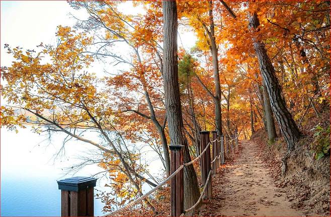 길 초입을 지나면 흙길과 데크길이 번갈아 이어집니다. 지금 시기엔 바닥이 낙엽으로 포근하게 덮여 있고 햇빛이 나무 사이로 스며들며 산책길 전체가 은은한 금빛을 띠죠. 이 길의 가장 큰 매력은 “걷기 자체가 힐링이 되는 경험”이라는 점입니다. 호수는 길 아래쪽에서 조용히 반짝이고, 바람이 불 때마다 물결이 은빛으로 흔들립니다. 산책로는 직선이 아니라 호수의 모양을 따라 부드럽게 굽이쳐 있어 눈앞 풍경이 조금씩 달라지며 지루할 틈이 없습니다.