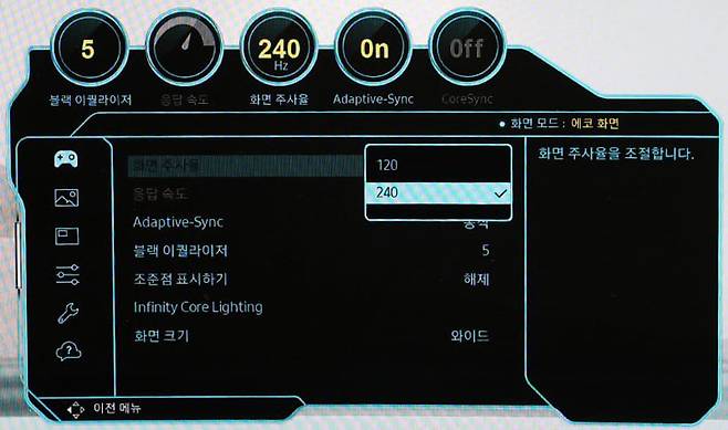 화면 주사율을 들어가보면 120㎐와 240㎐로 선택이 가능하다. 삼성 오디세이 G9 LS57CG950NKXKR 이 최대 240㎐를 지원하기 때문에 레이싱 등 속도감 있는 게임이나 동영상을 즐길 때에도 잔상 없는 상당히 부드러운 화면을 느낄 수 있다.