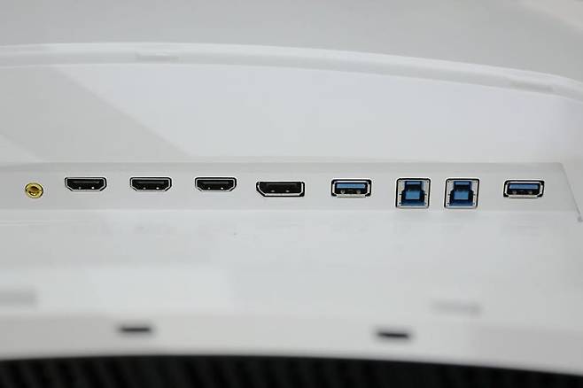 삼성 오디세이 G9 LS57CG950NKXKR은 커브드 모니터이다. 정면에서 볼 때에도 곡면이 느껴지지만, 위에서 바라보면 확연하게 휘어진 모습을 확인할 수 있다. 화면 곡률은 1000R로, 실제로 사용해보면 굉장한 몰입감을 느낄 수 있다.