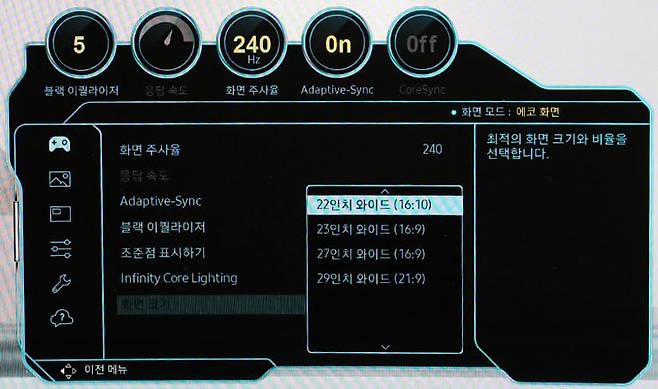 앞서 살펴본 후면의 라이팅 기능도 OSD의 게임 항목에서 설정할 수 있다. 화면 크기는 자동부터 17인치, 19인치, 21.5인치, 22인치 와이드, 23인치 와이드, 27인치와이드, 29인치 와이드 등으로 설정할 수 있다.