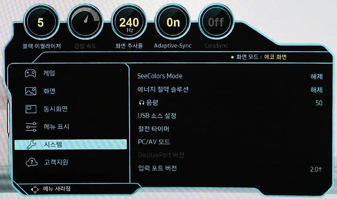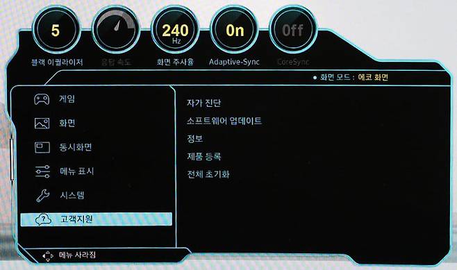 화면 하단의 버튼을 이용해 OSD 메뉴에 들어가보면 게임과 화면, 동시화면, 메뉴 표시, 시스템, 고객지원 등 여섯 개의 메인 메뉴를 확인할 수 있다. OSD의 상단에는 블랙 이퀄라이저와 응답 속도, 화면 주사율, 어댑티브 싱크, 코어싱크 설정 상태가 상시 표시된다.