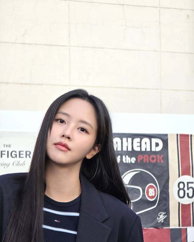 어깨에 가볍게 멘 블루 톤의 데님 숄더백은 소재의 통일감을 주면서도 실용적인 면모를 챙겼으며, 길게 늘어뜨린 생머리 스타일은 그녀 특유의 청순한 분위기를 배가시킵니다.