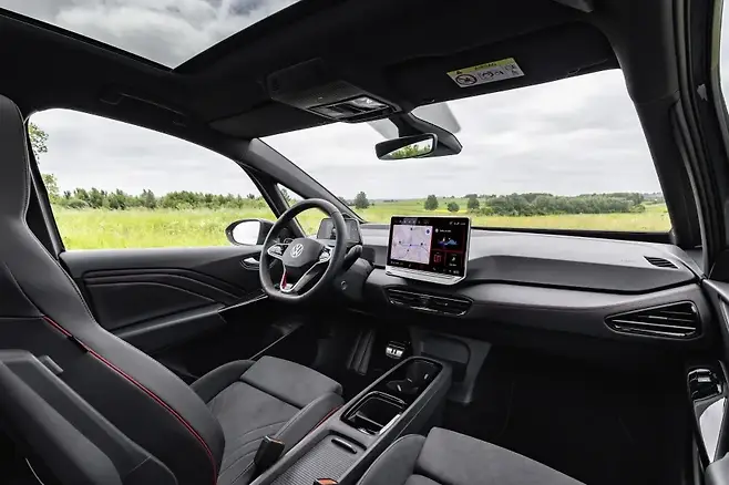 외관상 ID.3 GTX는 전용 범퍼와 사이드 스커트, 20인치 휠 등 미묘한 변화를 보인다. 실내에는 스포츠 시트와 레드 스티칭이 인상적이다.