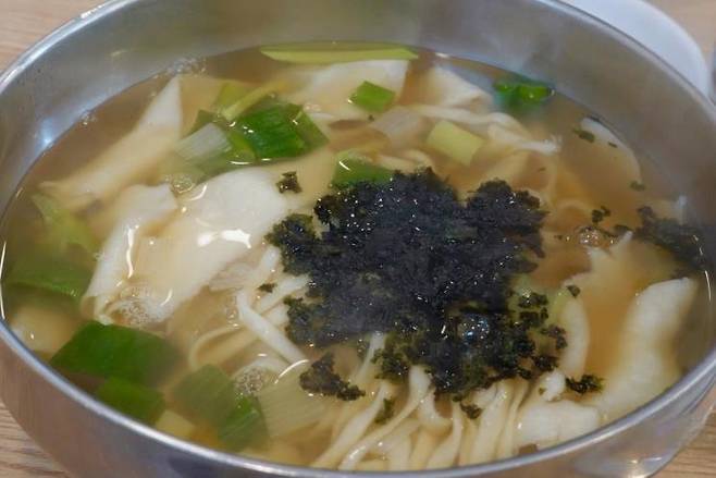 잘게 다져진 소고기와 얇게 채 썬 애호박이 고명으로 올라가 있다. 칼국수 면은 야들야들하고, 수제비의 피는 두꺼운 편이다. 국물은 녹진한 편으로 국물이 면과 수제비 속에 흠뻑 배어 있다. 또한 이곳의 장점은 무료로 사리와 공깃밥 리필이 가능해 더욱 배불리 먹을 수 있다.
