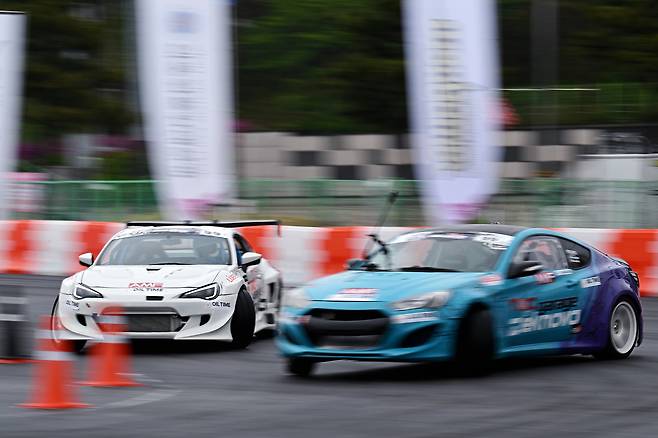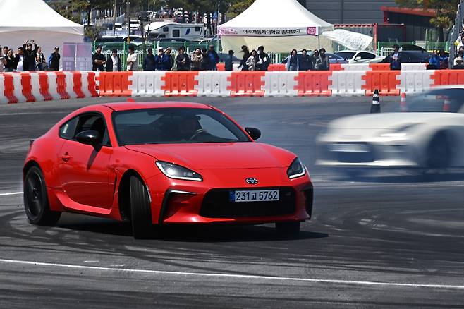 오후 1시 드리프트 경기 직전에는 토요타의 붉은색과 흰색 GR86 두 대의 특별한 쇼런이 펼쳐졌다. 특히 흰색 GR86은 박상현 아주자동차대학교 교수가 직접 운전했다. 두 차량은 좌우 대칭으로 회전하며 데칼코마니처럼 트랙을 그렸고, 차량이 사선으로 미끄러지며 정확히 라인을 따라가는 모습은 관중석에서 박수와 환호를 불렀다.