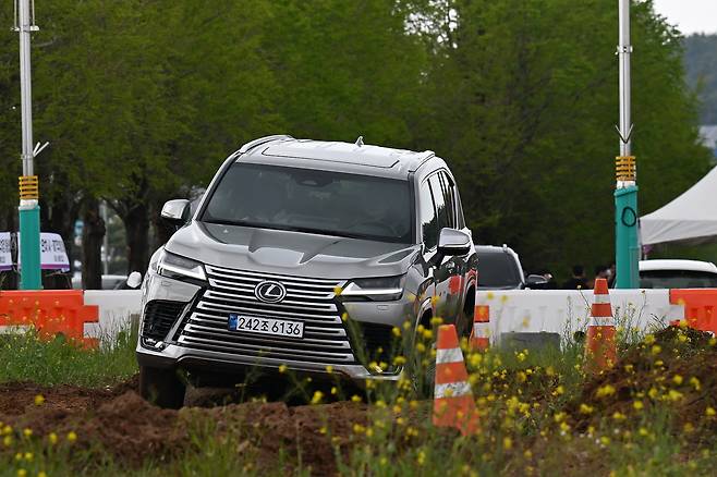 렉서스 부스에서는 LX 700h 차량을 타고 진흙과 물웅덩이를 통과하는 오프로드 코스 동승체험도 제공됐다. 헬멧을 쓴 채 탑승한 관람객은 출발과 동시에 덜컥대는 진입로에 비명을 지르고, 연이어 내리막을 내려가는 구간에선 탄성을 터뜨렸다. 온로드 구간에서는 RX 500h, NX 450h+ 등 렉서스 전동화 라인업이 직접 주행 시승용으로 투입됐다. 해안선을 따라 곡선을 그리는 도로에서 부드러운 가속력과 정숙성이 참가자들을 매료시켰다.