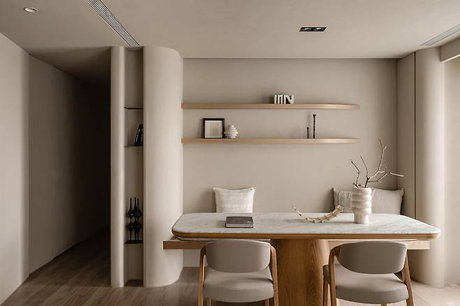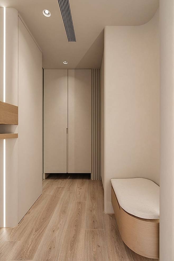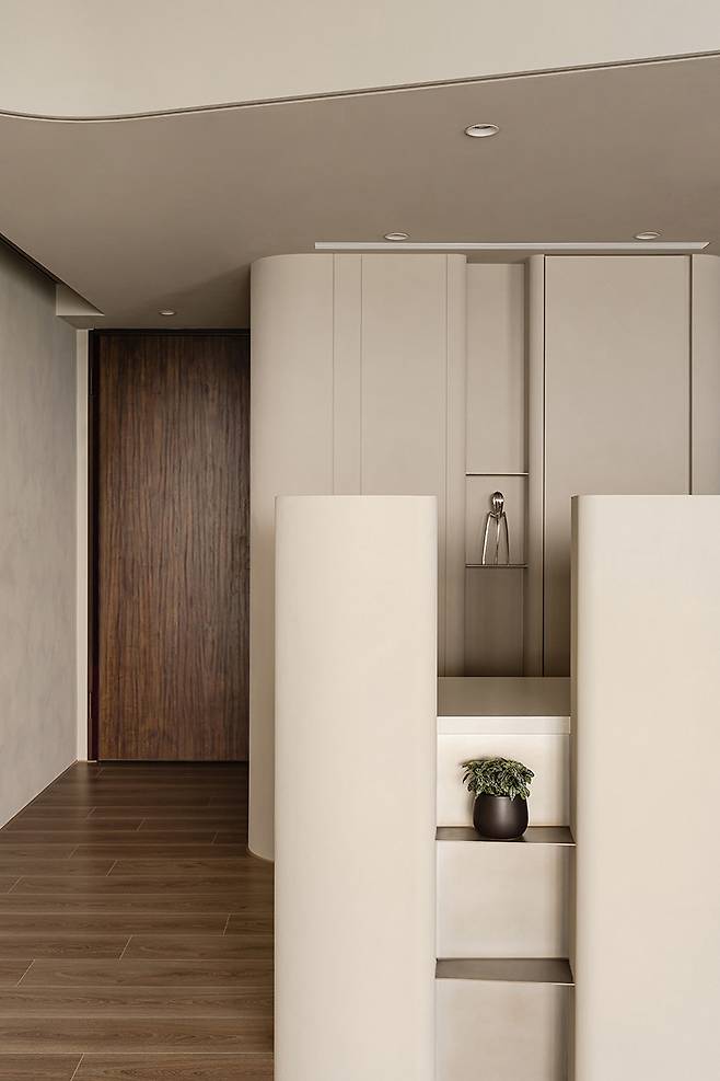 곡선 마감재와 부드러운 색감이 어우러진 덕분에 답답하지 않고, 오히려 편안한 흐름이 느껴지는 인테리어입니다.
