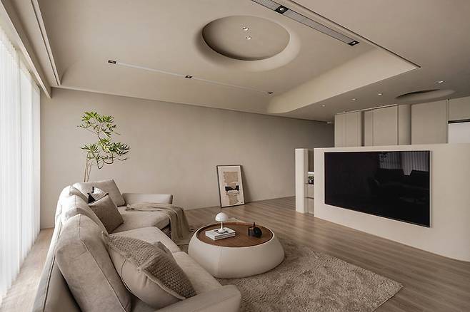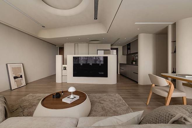 벽걸이 TV와 반커브 소파, 오픈형 주방을 연결한 가구 배치가 기존 아파트와는 조금 다른 분위기를 보여주고 있어요.