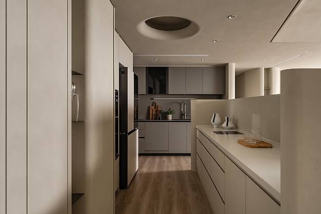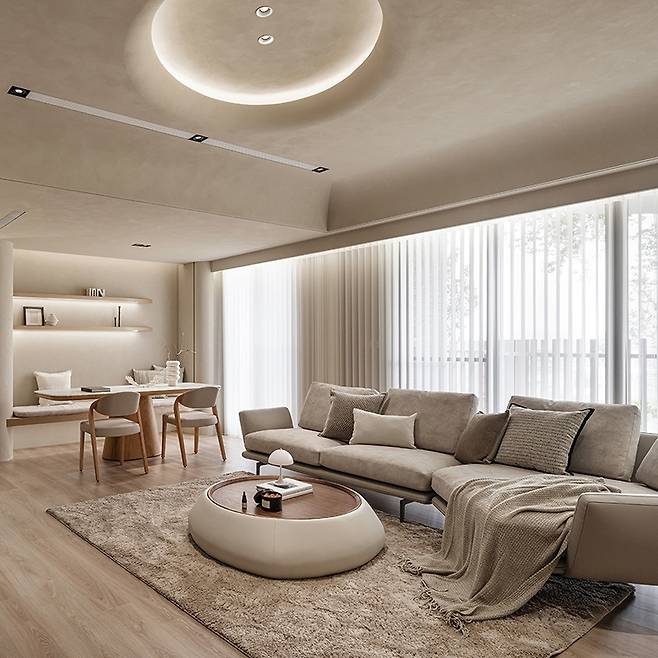 덕분에 주방과 거실이 자연스럽게 이어지고, 동일한 베이지 톤으로 맞춰 전체적인 통일감을 줍니다.