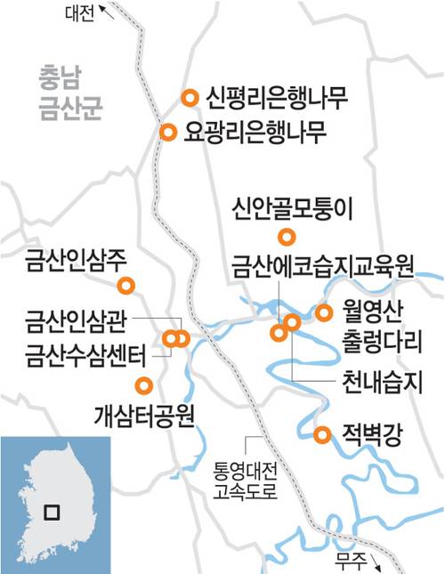 인삼 이야기는 이쯤하고, 금산에 있는 다른 것들을 얘기해보자. 금산에는 금강(錦江)이 있다. 금산과 금강은 짝을 이룬다. 금산이 ‘비단 금(錦)’에 ‘뫼 산(山)’이고, 금강이 ‘비단 금(錦)’에 ‘물 강(江)’이다. 산도, 물도 이름이 다 ‘비단(錦)’이다.