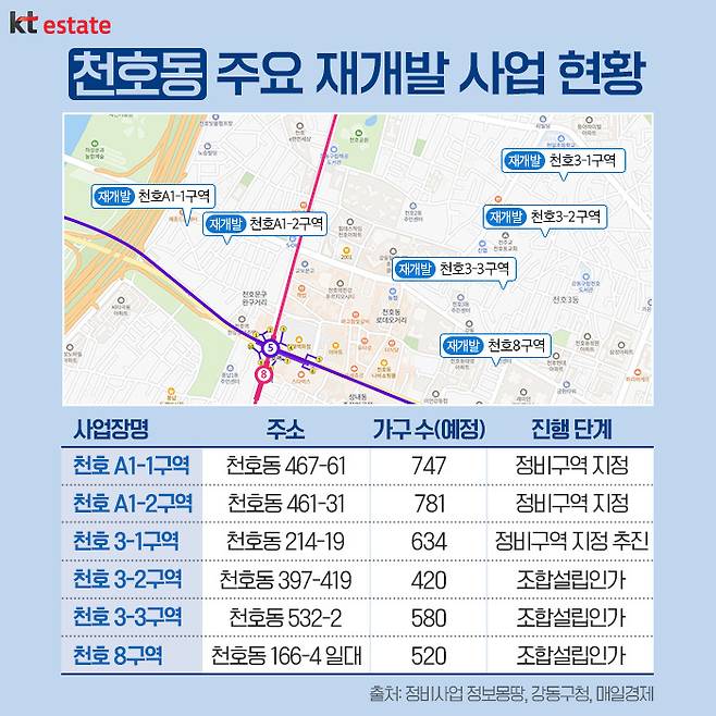 이 외에도 천호 A1-1구역과 A1-2구역이 최고 40층에 각각 747가구와 781가구 규모로 아파트가 조성될 예정인데요. 천호 A1-1구역은 지난해 말 공공재개발 정비구역으로 지정됐으며, 천호 A1-2구역은 지난해 3월 정비구역으로 지정된 바 있습니다. 또한, 천호역 일대 마지막 퍼즐로 불리는 천호8구역(520세대 예정)은 지난해 조합설립인가를 받고 다음 단계를 준비하는 것으로 알려졌습니다.