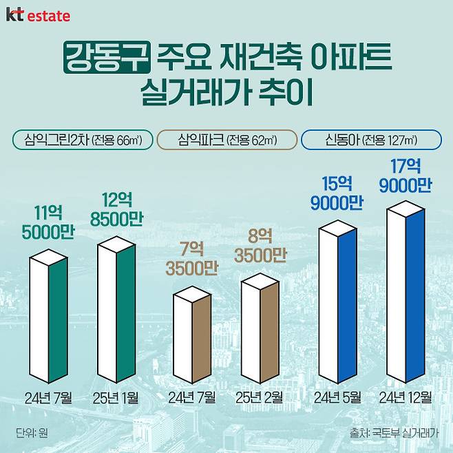 이 시기 아파트 실거래가도 크게 뛰었는데요. 국토부 실거래가에 따르면, 명일동 삼익그린2차 전용 66㎡는 올해 1월 13층이 12억8500만원으로 지난해 7월 11억5000만원(10층)보다 반년 만에 약 2억원이 상승했습니다. 명일동 신동아 역시 전용 127㎡가 지난해 12월 17억9000만원(2층)에 실거래되며, 5월 15억9000만원(13층)보다 2억원 올랐습니다. 삼익파크는 올해 2월 전용 62㎡가 8억3500만원(11층)에 매매되며 지난해 7월 7억3500만원(3층)보다 1억원 상승했습니다.