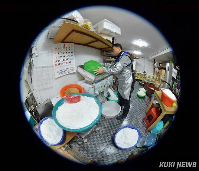 21일 오전 서울 송파구 마천동 마천중앙시장 내 떡집은 설을 앞두고 평소보다 몇 배 더 분주한 모습이다. 56년의 역사를 자랑하는 시장떡집의 3대 주인인 김덕화(61)·김성미(57) 부부는 이른 아침부터 뜨거운 김이 모락모락 피어오르는 기계에서 쉴 새 없이 가래떡을 뽑아냈다.