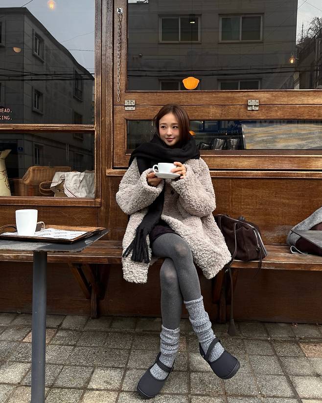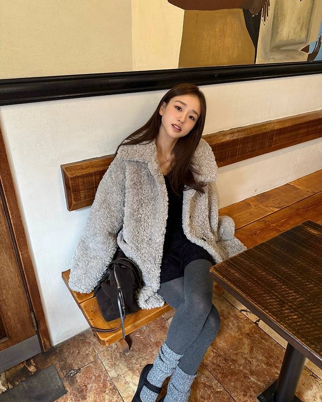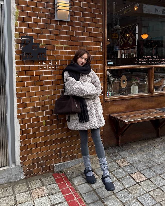 부드러운 양털 소재의 뽀글이 코트를 메인으로 선택해서 시각적인 따뜻함을 주는 동시에 무거워 보이지 않는 화사한 라이트 그레이 톤으로 세련미를 더했네요.
