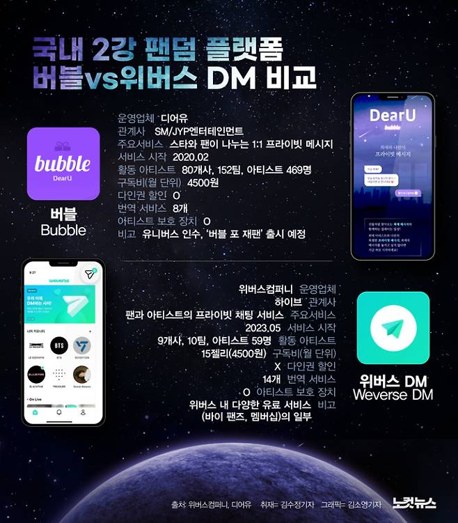 지난해까지만 해도 팬덤 플랫폼은 버블vs유니버스vs위버스로 3파전이었다. 버블은 2020년 2월 업계 최초로 시작한 1:1 대화형 메시지를 통해 독자적인 영역을 구축했고, 유니버스는 버블과 유사한 '프라이빗 메시지'를 포함해 다양한 독점 콘텐츠를 제공했으며, 위버스는 방탄소년단을 비롯한 다채로운 아티스트의 공식 팬 커뮤니티를 주 무기로 두고 경쟁했다.